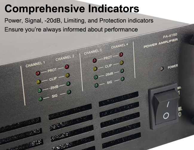 Power, Signal, -20dB, Limiting, and Protection indicators ensure you’re always informed about performance.